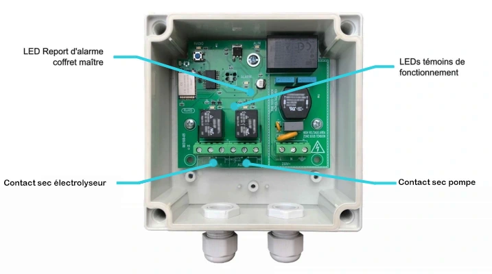 Contrôle sans fil de l'électrolyseur et de la pompe de piscine via des relais auxiliaires, asservi à la couverture.