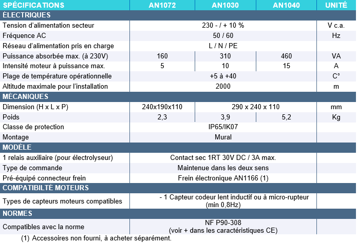 Pour moteurs sans carte de pilotage embarquée à capteur codeur lent inductif ou type micro-rupteur, alimentation 230VAC / 24VDC intégrée.